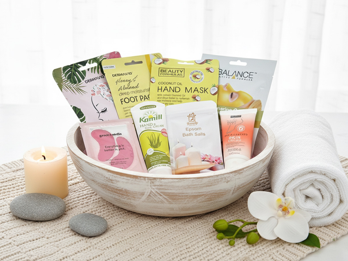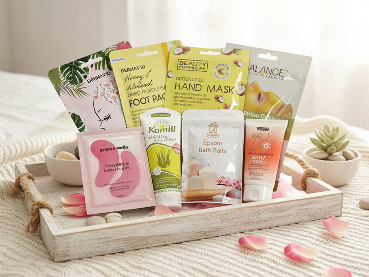 Inside the beautifully presented pink box, you’ll find an exquisite selection of pampering essentials: four assorted hand, face, and hair masks to refresh and revitalise, a soothing peppermint foot lotion to nourish tired feet, and a relaxing foot soak that transforms any bath into a spa-like retreat. The Epson relaxing bath salts help melt away stress, while the nourishing hand cream ensures soft, smooth skin. Complete your pampering experience with a calming eye mask that promotes relaxation and rest.